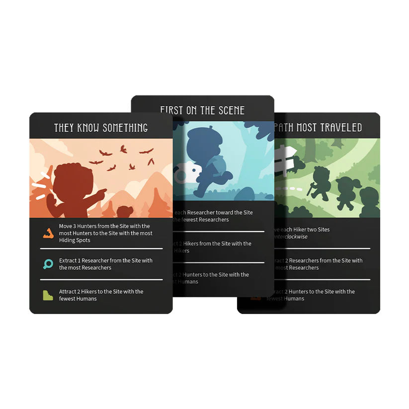 InCryptid, players choose a Cryptid with unique powers and hiding spots and use Action cards to determine the affects if they are spotted. Players also get Hidden Trait cards with objectives that you’ll try to achieve by the end of the game in order to score bonus Myth.