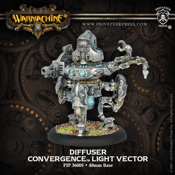 The Diffuser is a clockwork marvel equipped with a ripspike launcher and a sophisticated arcane relay. The individual ripspikes bear tiny fins controlled by a clockwork mechanism. This allows the arcane relay to adjust the trajectory of each ripspike, maximizing the probability of every shot striking true. The relay sends similar signals to other vectors, clockwork vessels, and priests of Cyriss to direct their efforts toward targets marked for immediate termination.