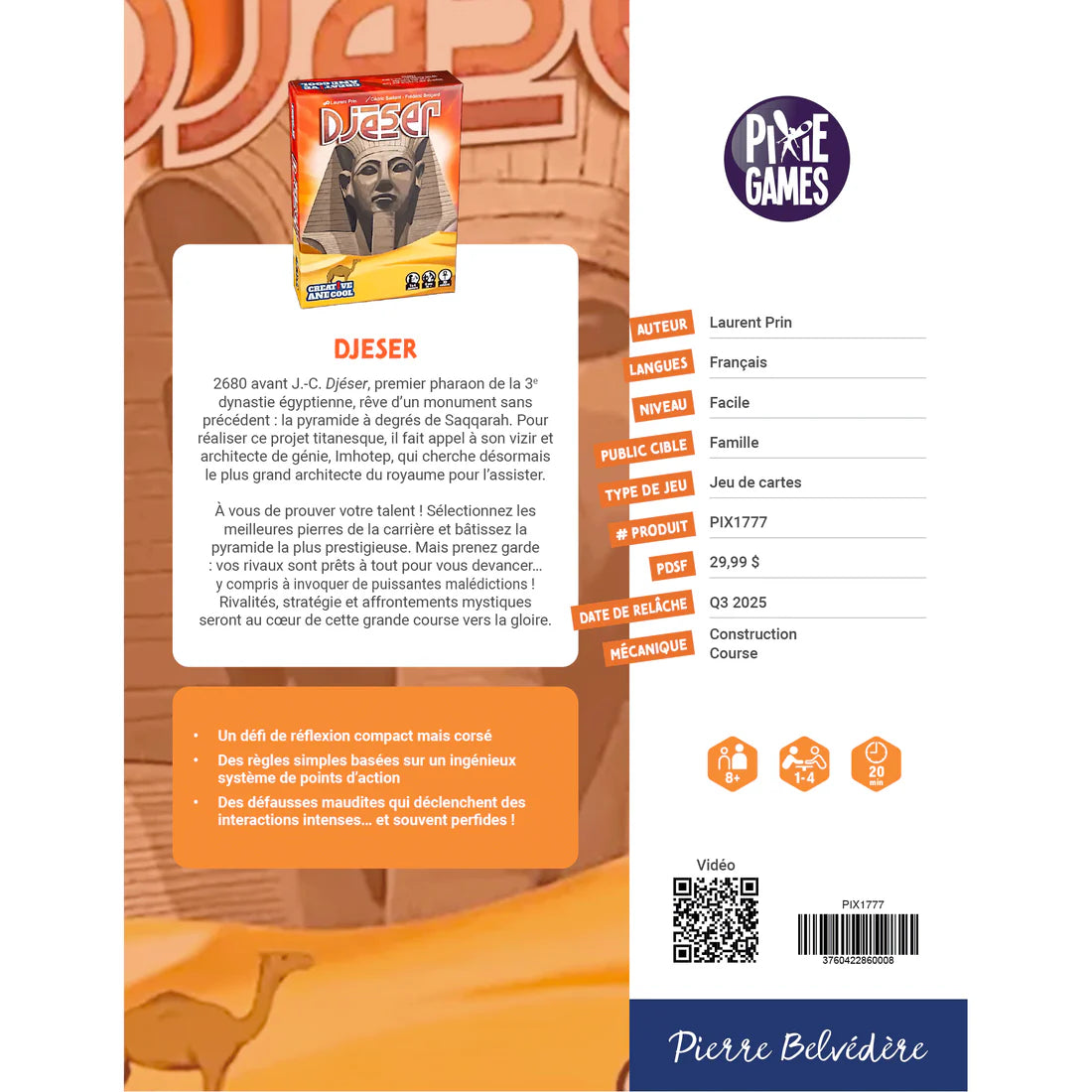 2680 avant JC, Djéser est le premier pharaon Égyptien de la 3ème dynastie. Il a pour projet d'ériger ce qui deviendra le premier édifice monumental de l'histoire : la pyramide à degrés de Saqqarah. Pour ce faire, Djéser mandate son Vizir et architecte : Imhotep. Afin de l'assister dans la construction, Imhotep recherche le plus grand architecte d'Egypte. Vous êtes donc conviés pou prouver votre valeur et devenir le grand architecte de la nouvelle pyramide ! A vous de choisir les meilleurs pierres de la carrière pour ériger la plus prestigieuse des pyramides. Mais attention ! Une telle destinée suscite bien des convoitises et tous les coups sont permis pour arriver à ses fins. Il faudra résister aux malédictions envoyées par vos adversaires pour réussir !