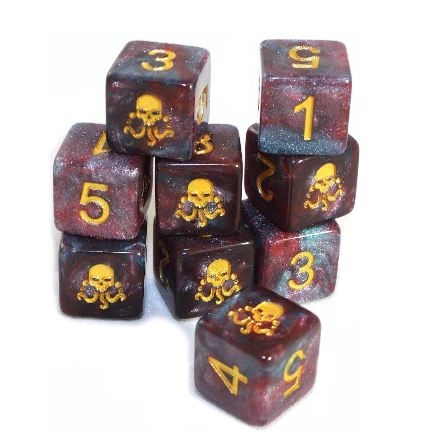 This set features the Seal of Yog-Sothoth, a cryptic mark left in the margins of books devoted to the occult. The symbol replaces the "6" on each die.