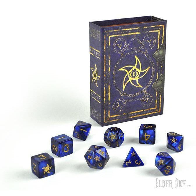 Each set of Elder Dice contains the complete set of nine polyhedral gaming dice: 1 four-sided die, 3 six-sided dice, 1 eight-sided die, 1 ten-sided die, 1 ten-sided percentile die, 1 twelve-sided die, and 1 twenty-sided die.