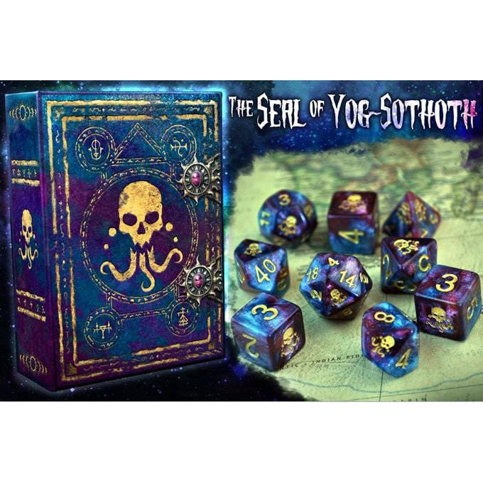 Elder Dice add the perfect magical touch to any fantasy or horror roleplaying game. They are also great for enhancing your favorite board games. This set features the Seal of Yog-Sothoth, a cryptic mark left in the margins of books devoted to the occult. The symbol replaces the highest value of each die.