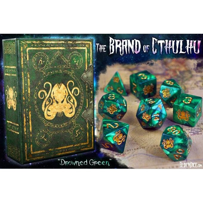 The Brand of Cthulhu dice are part of the Elder Dice collection. They add the perfect magical touch to any fantasy or horror roleplaying game. They are also great for enhancing your favorite board games. This set features a symbol of Great Cthulhu in gold on drowned green dice.