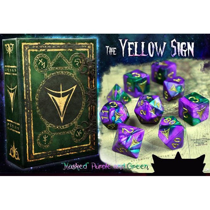 Elder Dice add the perfect magical touch to any fantasy or horror roleplaying game. They are also great for enhancing your favorite board games. This set features the Yellow Sign, a strange glyph thought to be in the language of Carcosa. The symbol replaces the highest value of each die. This set of Yellow Sign dice is the purple and green "Masked" edition.