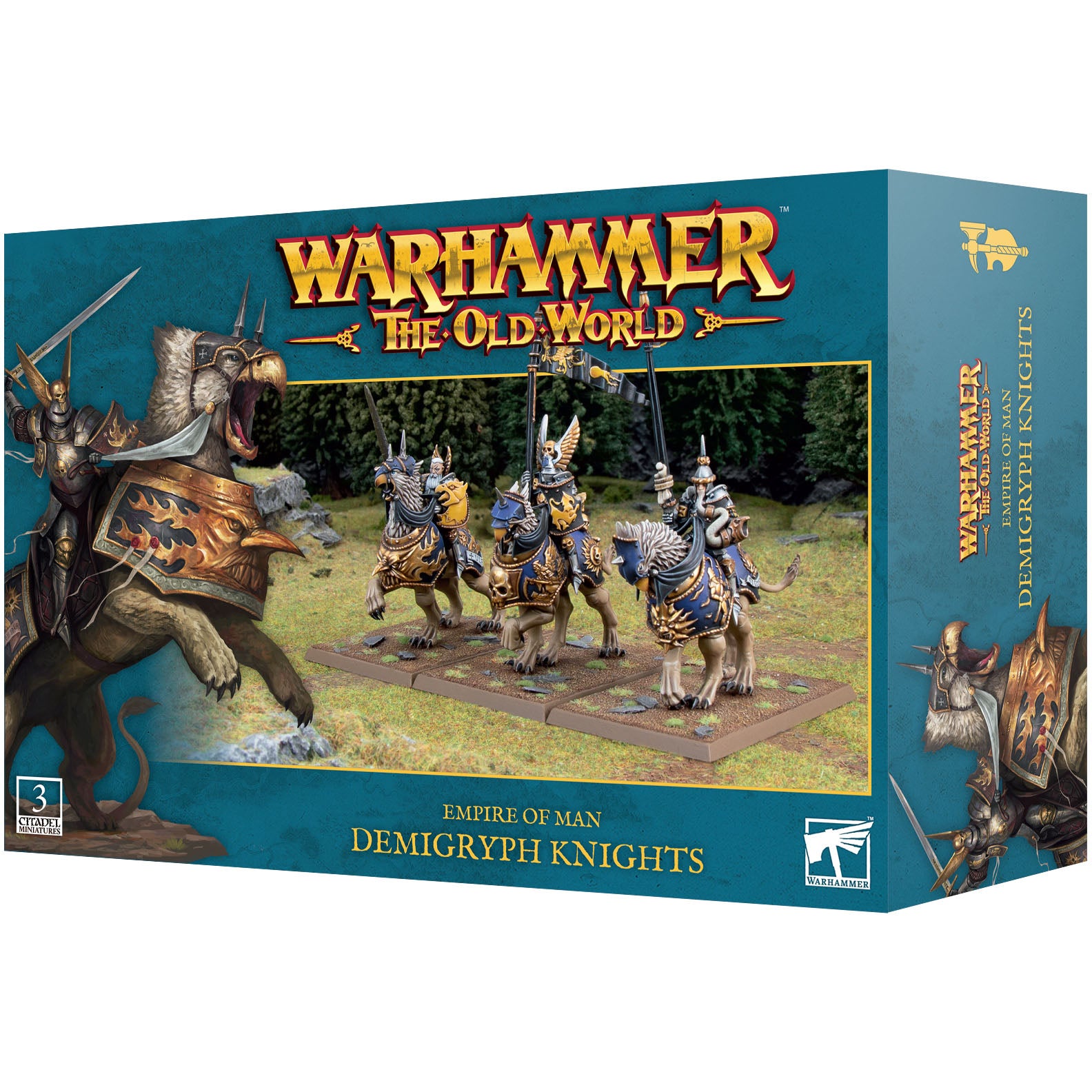 This multipart plastic kit builds three Demigryph Knights for use in your Empire of Man army in Warhammer: The Old World. Each of these armoured knights can be equipped with either a long-handled halberd or a lance, and there are parts to build an optional champion, standard bearer, and musician. You can customise your unit further with different shield designs and heads.