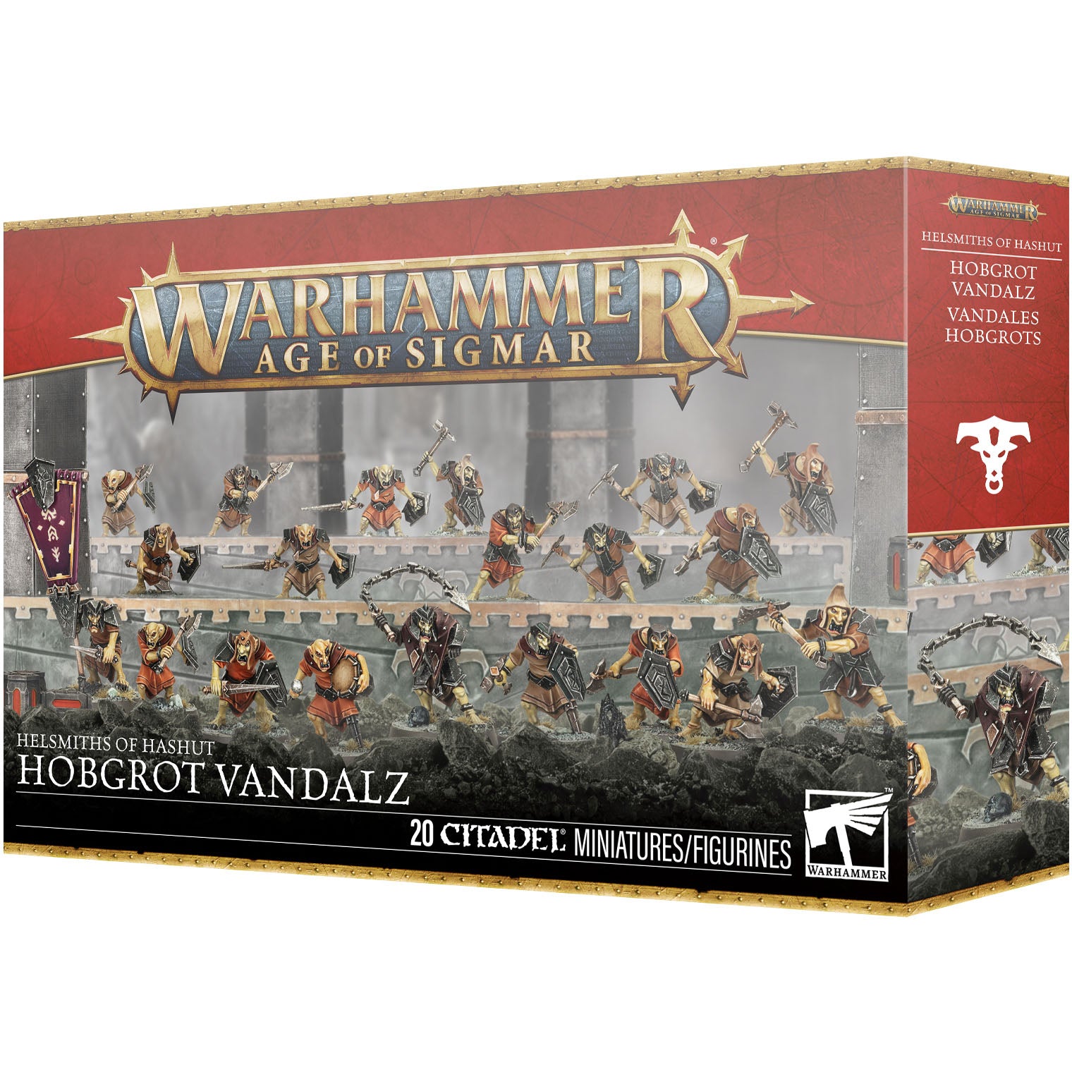 Hobgrots are furtive and deceitful creatures who recognise the might of the Zharrdron empire, or the relative safety offered by ingratiating themselves with those who would otherwise wipe them out, at least. Their lot in life is still a miserable one, as the Helsmiths deploy them ahead of their main battleline to secure an advantage… and to range their brutal artillery. This box contains twenty Hobgrot Vandalz, whose champion can be armed with a cruel chain weapon or a vicious dagger. It also contains a Helsmiths of Hashut transfer sheet with 450 transfers.*