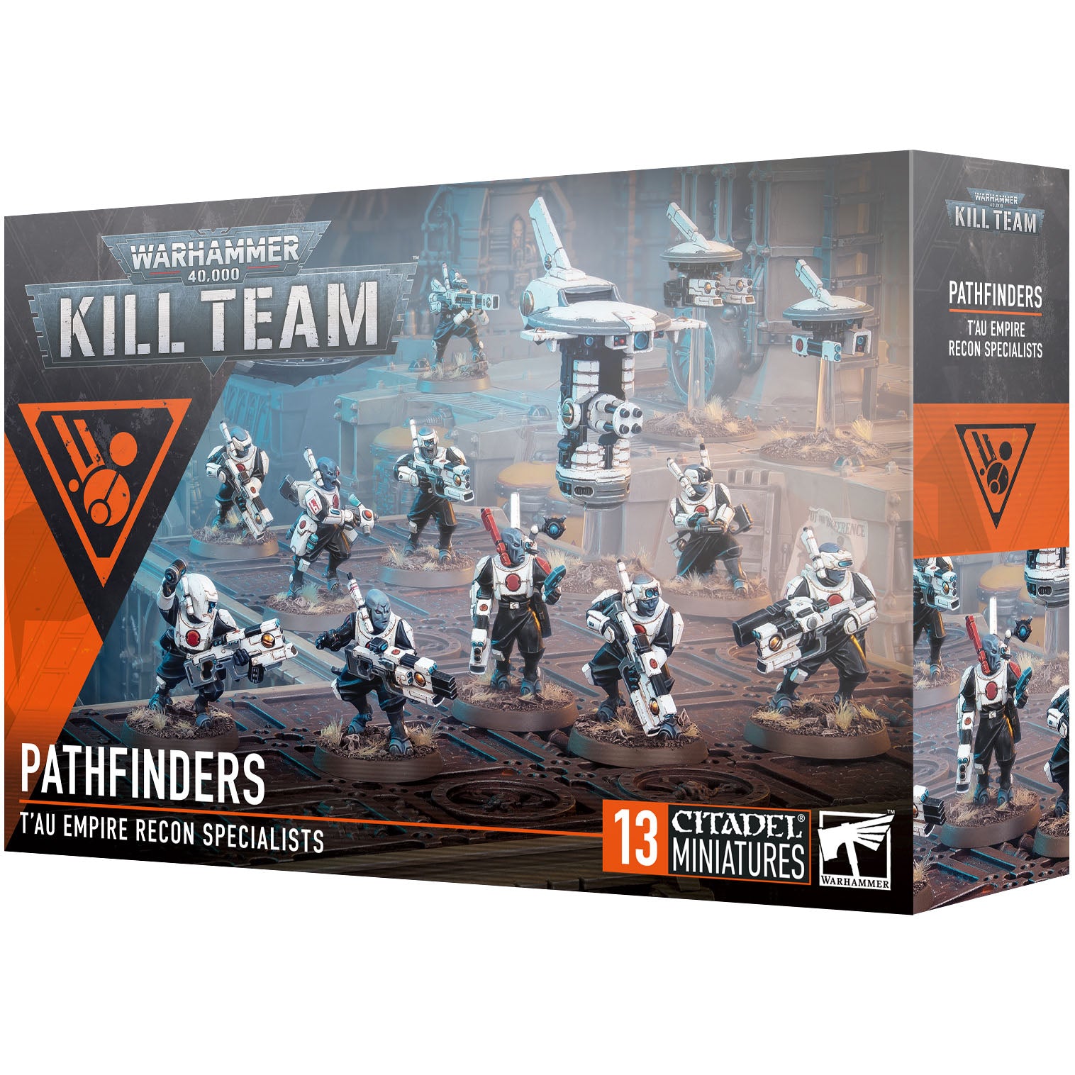 A fledgling race on the galactic stage, the T’au Empire fight for their future with high-tech weaponry and plucky optimism. Their Pathfinder teams are expert scouts and covert operatives who slip behind enemy lines and outgun their foes. This set of 13 miniatures builds a kill team accompanied by three drones, with options for specialists like the Drone Controller, Assault Grenadier, and Medical Technician. They come with a unique token sheet, and a transfer sheet containing 185 decals. A separate deck of 41 Datasheet cards will be released alongside them, containing faction rules and equipment, unique plots, operative profiles, and other useful information.