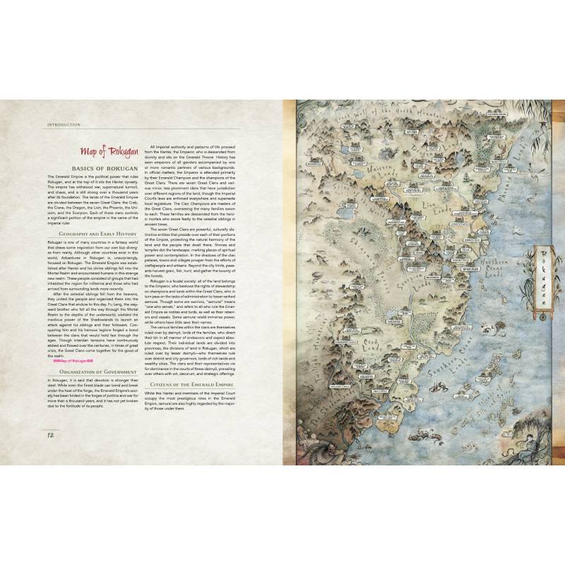 Rokugan. The Emerald Empire... For thousands of years, the samurai of the Great Clans have served the Hantei Emperor in guiding this land’s destiny. But now, danger besets Rokugan on all sides. While the Great Clans march to war with one another, blood magic users corrupt the Empire from within, the spirits of the restless dead haunt its wilds, and to the south, hordes of foul oni batter against the Kaiu Wall, the last defense against the vile demons pillaging Rokugan.