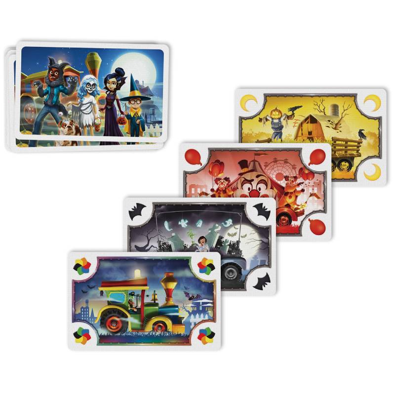 Dans cette version horrifique du classique Les Aventuriers du Rail : Mon Premier Voyage, parents et enfants collectent des cartes Parade et placent leur chariots hantés sur le plateau pour relier les différents emplacements de cette bien étrange petite ville. « Toc toc ! Des bonbons ou un sort ! »