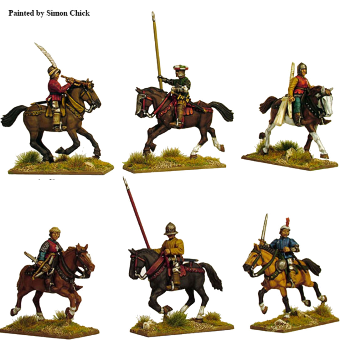 The box contains 12 lightly armoured horsemen which can be assembled with light lances, crossbows or as mounted archers. command options are included as are banners and historical information.