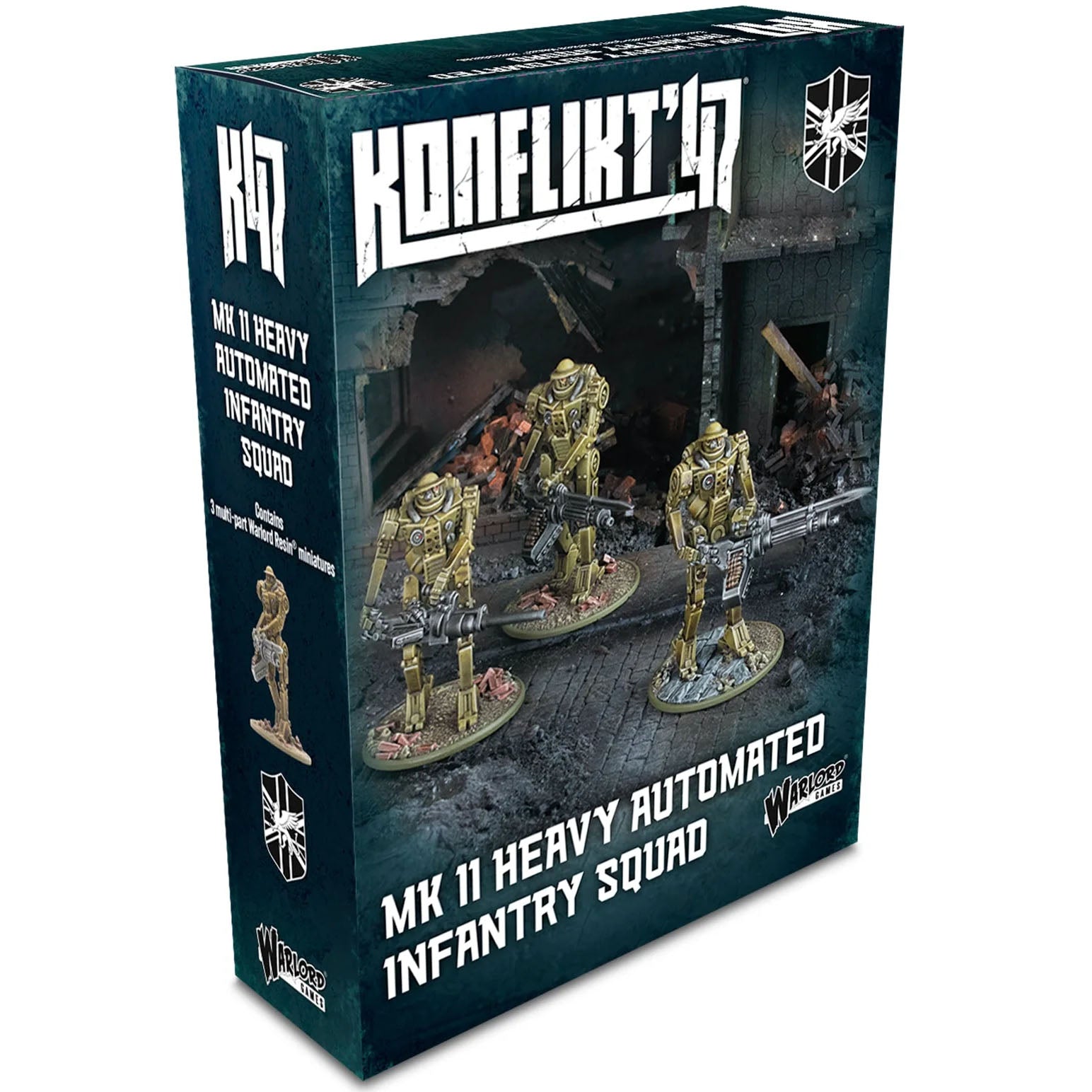 Box contains three Warlord Resin Mk II Heavy Automated Infantry (two armed with Light Automatic Cannons and one with a heavy Automatic Cannon), plastic bases, and assembly guide.