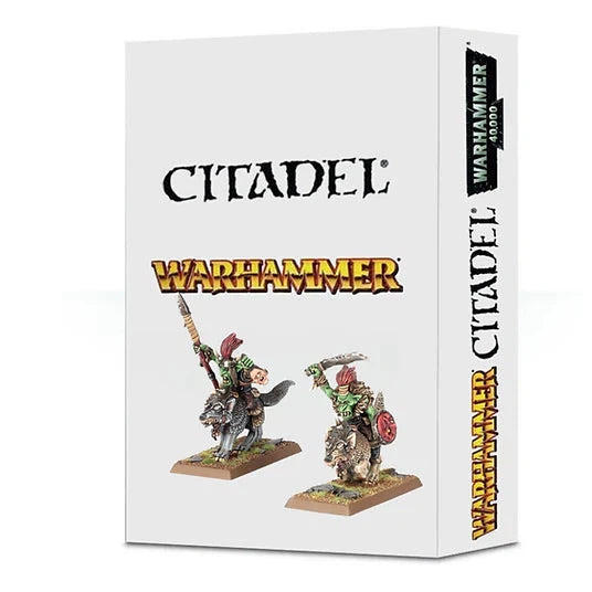 This multipart metal and plastic kit builds two Goblin Wolf Rider Bosses for use in Orc & Goblin Tribes in games of Warhammer: The Old World. These fast-moving and ravenous mounts allow these vindictive Goblin Bosses to maraud around the battlefield picking on friends and foes alike.