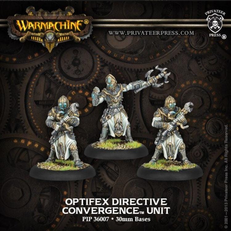 Eager to advance the Great Work, flesh-and-blood priests of the Convergence take to battle alongside the clockwork soldiers of their goddess at tremendous personal risk. Each optifex in a directive carries a plethora of tools both to repair vessels and vectors and to effect rapid recalibrations in response to shifting combat needs. In combat these priests stay in constant motion, each a part of a carefully orchestrated plan to service the cogs in Cyriss’ machine of war.