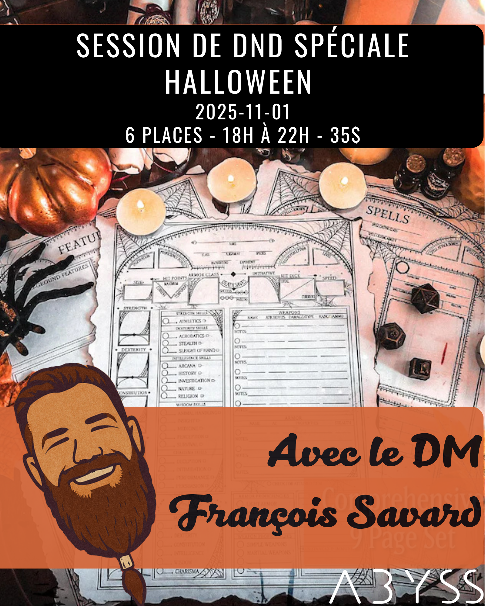 À propos du maître de jeu, dans ses propres mots : François Savard est un praticien-chercheur en études du jeu qui a passé beaucoup trop d’heures de sa vie à jouer à une très grande variété de jeux de rôles. Que cela soit au Comiccon de Montréal, au Musée du Jeu en Suisse, ou juste dans son salon, François est là pour vous faire découvrir un monde fantastique et inclusif qui sera toujours adapté à vos sensibilités.