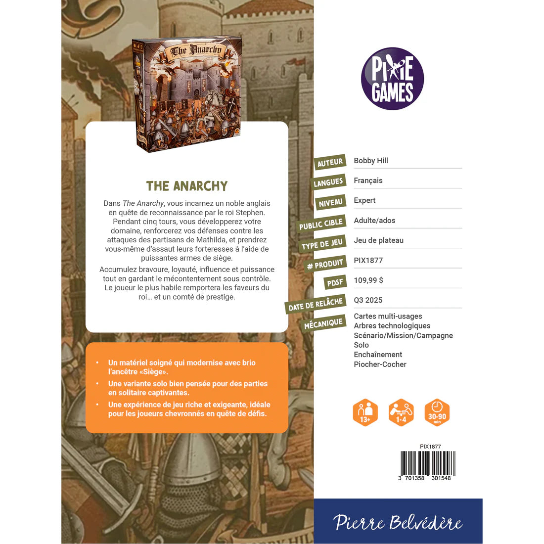 The Anarchy est un jeu expert de Flip & Write pour 1 à 4 joueurs issu de la gamme Ancient Anthology de l'éditeur Garphill Games dans lequel les fidèles alliés d'Etienne assiègent la rébellion de l'impératrice Mathilde !