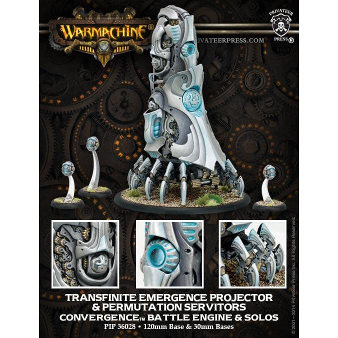 A weapon of unrivaled sophistication, the transfinite emergence projector delivers tremendous but precise destruction. In concert with its orbiting permutation servitors, it can modulate its weaponry for pinpoint accuracy, destructive intensity, or area saturation. The servitors also function as expendable shields, ensuring the projector survives to apply its devastating force to all enemies of the Clockwork Goddess.