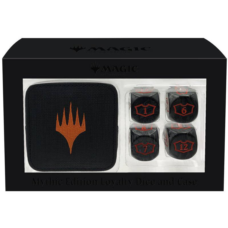 The Mythic Editions are Ultra PRO’s most premium accessories for Magic: The Gathering. This Dice Case features a black leatherette material with a mythic orange embroidered Planeswalker symbol and matching stitching, and includes a set of four Loyalty Dice. Each face features the iconic "loyalty" outline with numbers 1-6 on two dice and 7-12 on the other two dice, allowing you to save up for that ult with a single die face representing your progress clearly.