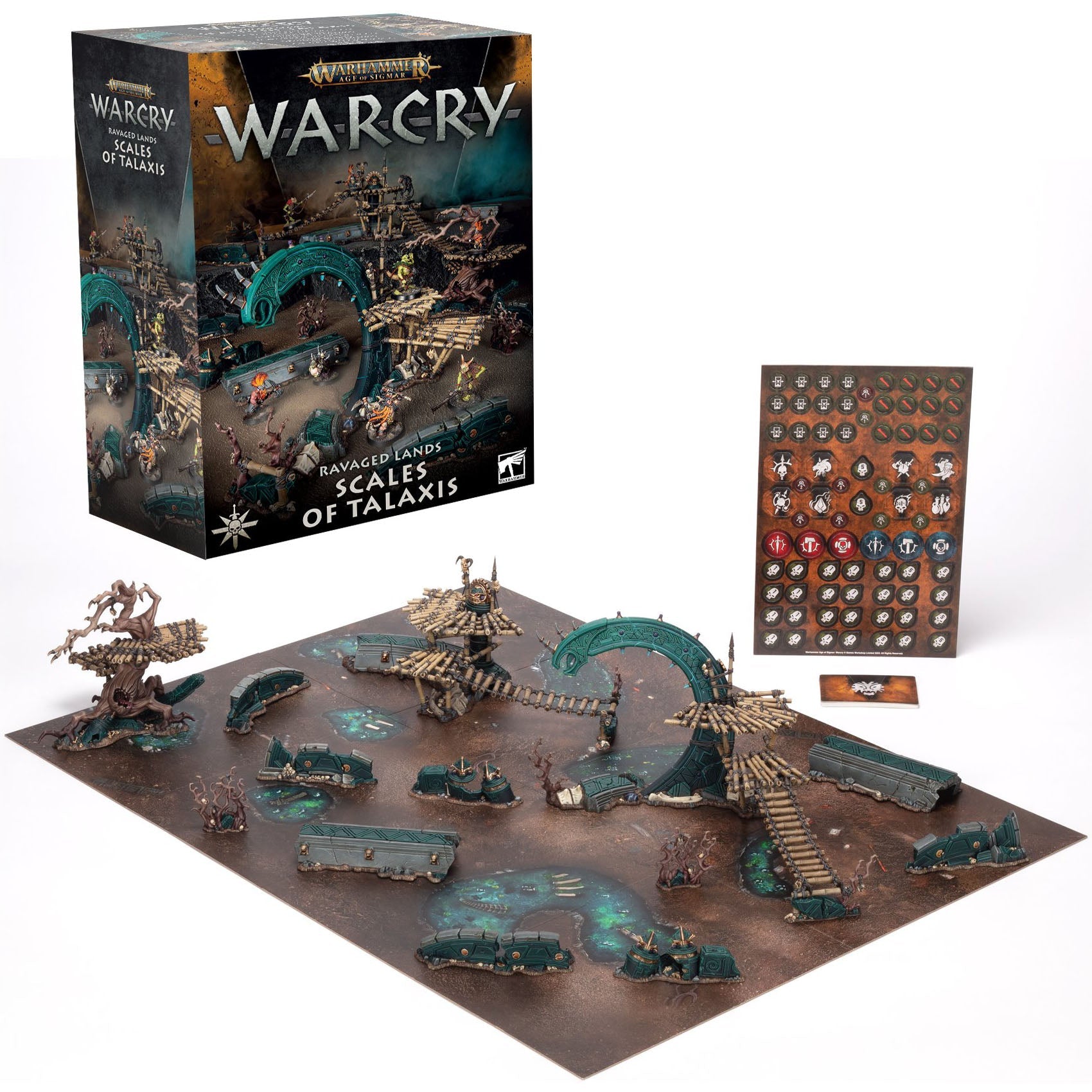 • Contains 17 pieces of themed scenery, a double-sided gaming board, terrain cards, and tokens