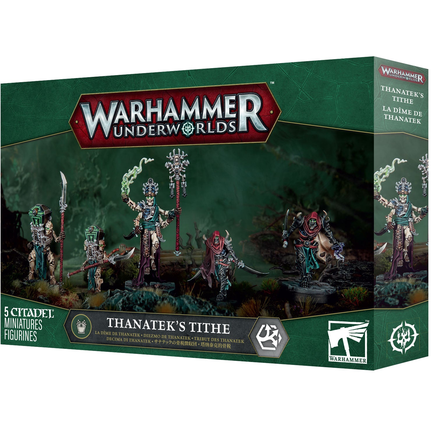 The hidden battlefields below Embergard are not immune to the reach of Nagash and his elite warriors, who are on the hunt for ‘truebone’ – osseous matter imbued with unusual purity – in Warhammer Underworlds. Thanatek’s Tithe is a Flex-style warband of five Ossiarch Bonereapers miniatures, led by the Ossiarch agent Thanatek.