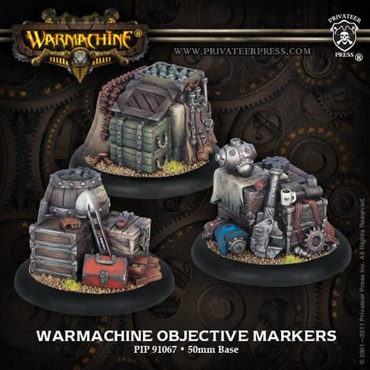 Representing battlefield commodities such as warjack parts, ammo cache, and food stores, these resin objective markers add style and panache to your gaming table and scenarios.