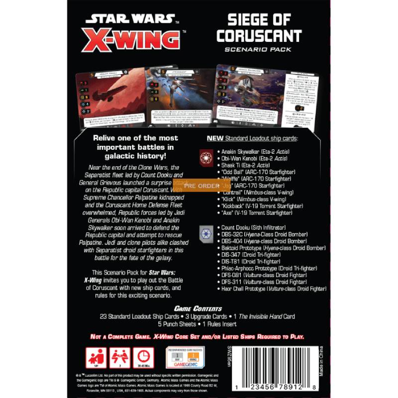 Siege of Coruscant puts players on both sides of this monumental battle, with one player commanding the Republic forces desperately trying to rescue Supreme Chancellor Palpatine from the clutches of the Separatists and the other player attempting to stop them. With 23 ship cards featuring a standard loadout combining pilots and upgrades, this pack gives players everything they need to create their own custom squads and play out this thrilling scenario!